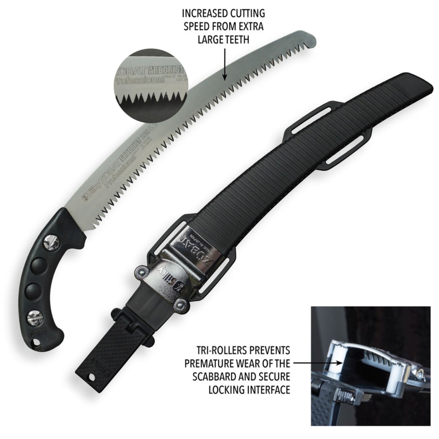 The Zubat is one of the most used handsaws by professional arborists worldwide - so Silky tweaked it into the Arborist version. The Zubat Arborist has the same design and aggressive curve as the Zubat Professional 330, but with extra large teeth that slice through wood faster and with less effort than ever before.